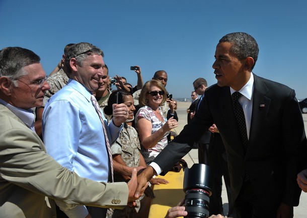 President Barack Obama hugs Julie Chavez Rodriguez, Deputy Director of Public Engagement (Cesar Chavez’s granddaughter), as he arrives at a screening of the film “Cesar Chavez”