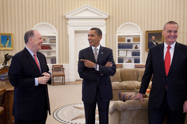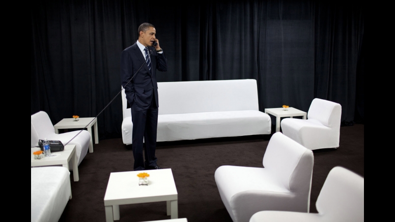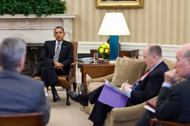 President Obama talks with National Security Advisor Tom Donilon before a phone call with President Mohammed Morsi of Egypt, aboard Air Force One, Nov. 20, 2012. (Photo by Pete Souza)