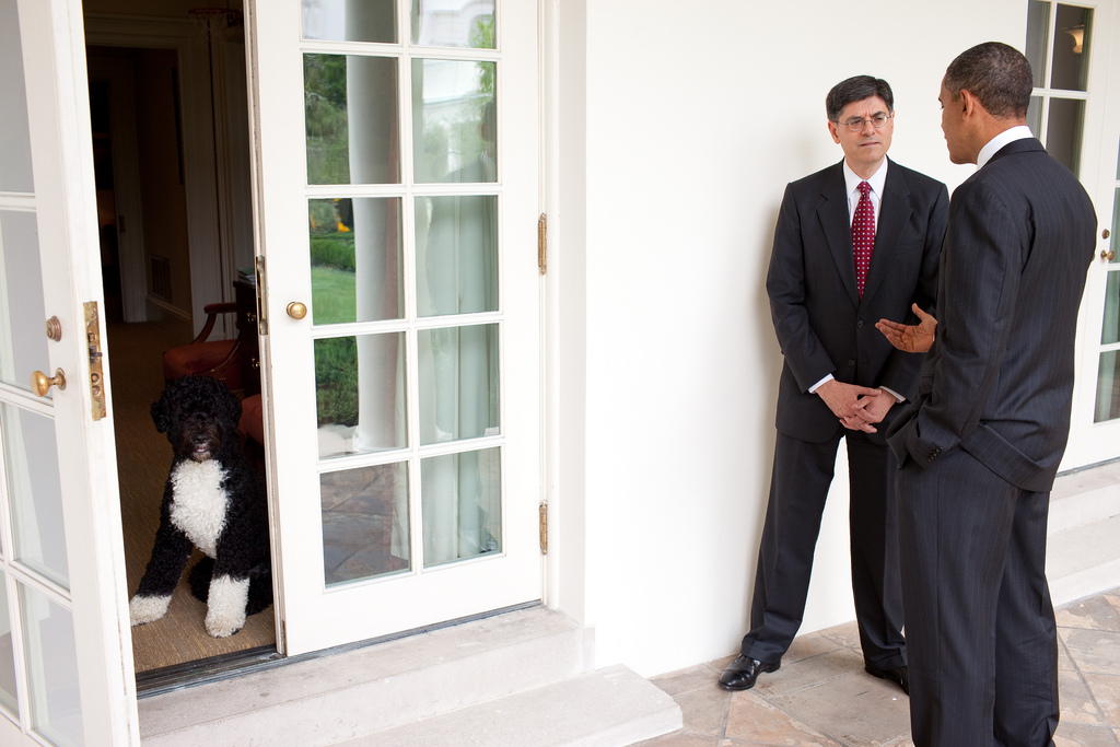 President Barack Obama talks with Jack Lew on the Colonnade of the White House, after he announced Lew’s nomination to replace Peter Orszag as director of the Office of Management and Budget, July 13, 2010. At left, Bo, the Obama family dog, waits for the President inside the doorway of the Outer Oval Office. (Official White House Photo by Pete Souza)