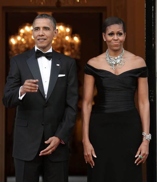 First Lady Michelle Obama greets soccer star David Beckham at a dinner in honor of Queen Elizabeth II at Winfield House in London, May 25