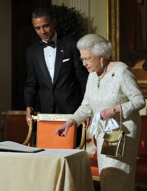 . President Obama watches as Queen Elizabeth signs a guest book after a reciprocal dinner at Winfield House