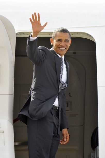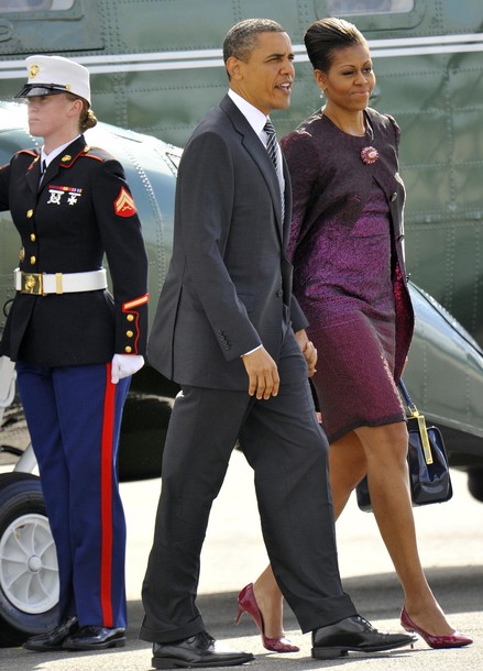 President Obama walks with first lady Michelle Obama before he boards Air Force One at London’s Stansted Airport