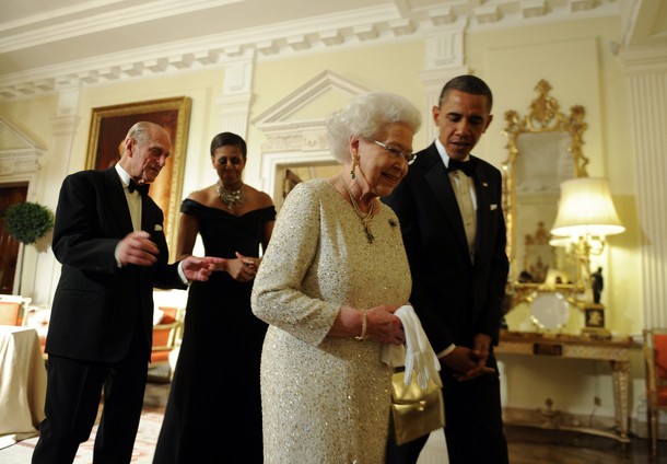 President Obama and first lady Michelle Obama welcome Queen Elizabeth and Prince Philip for a reciprocal dinner at Winfield House