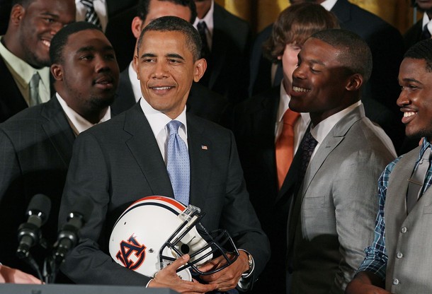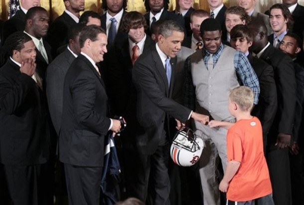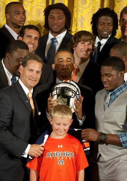 President Barack Obama receives an Auburn University football jersey and helmet during a ceremony in the East Room of the White House honoring the 2010 NCAA BCS Football Champion football team