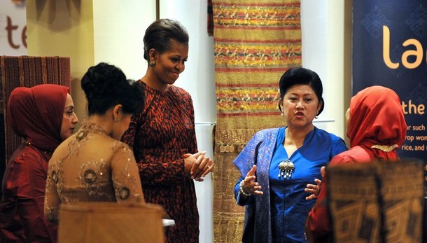 US First Lady Michelle Obama tours the ‘Living Traditions Exhibition at Wisma Negara’ with her host, Indonesian First Lady Ani Yudhoyono, on November 9 in Jakarta, Indonesia