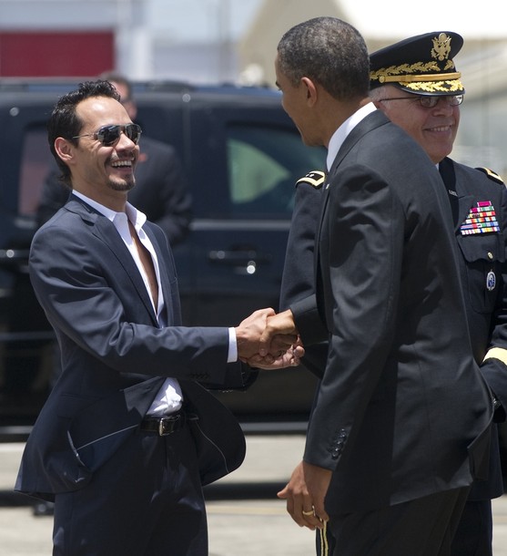 President Obama greets singer Marc Anthony at Luis Munoz Marin International Airport