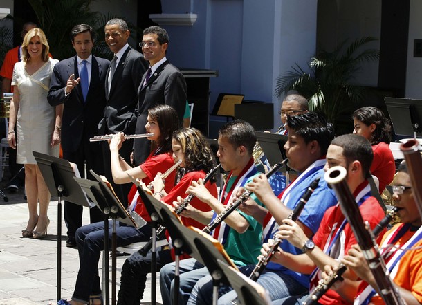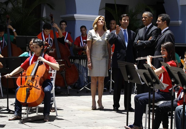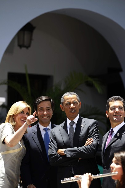 From left, Musician Marc Antony, Puerto Rico Mayor Jorge Santini Padilla, President Obama, Puerto Rico Gov. Luis Fortuno, Rep. Pedor Pierluisi, D-Puerto Rico, and Adjutant General of the Puerto Rico National Guard Antonio J. Vicens