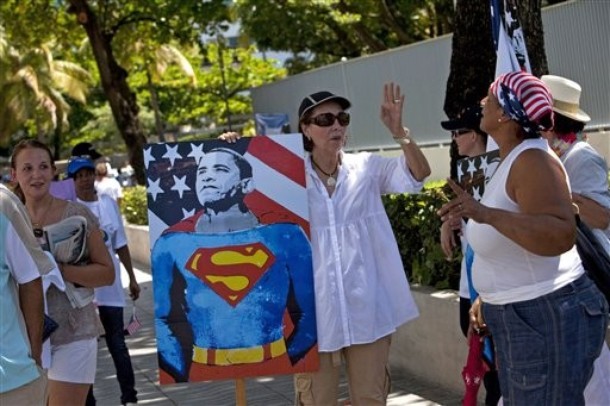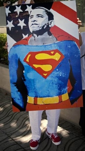 A woman holds an image of President Obama, dressed as Superman, as she waits for the presidential motorcade in San Juan