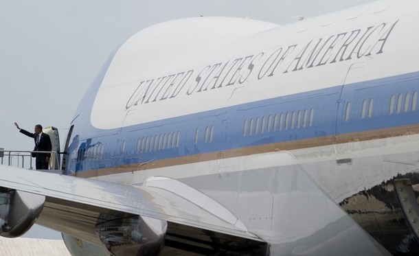 President Obama waves from Air Force One prior to departing Luis Munoz Marin International Airport
