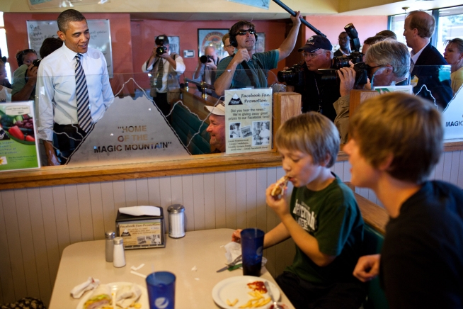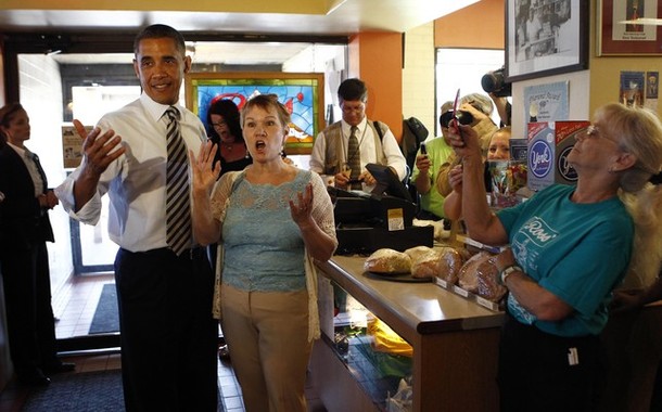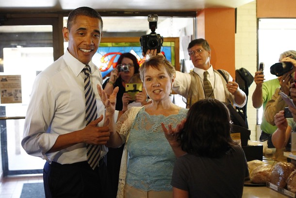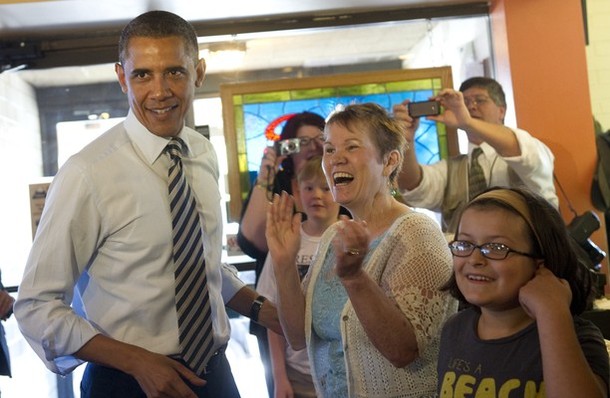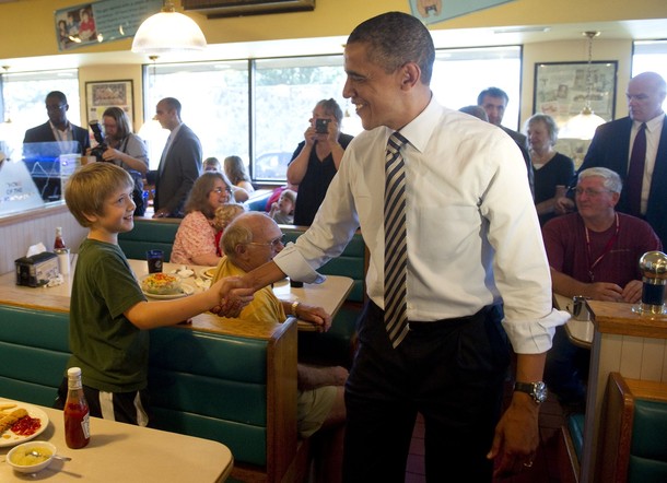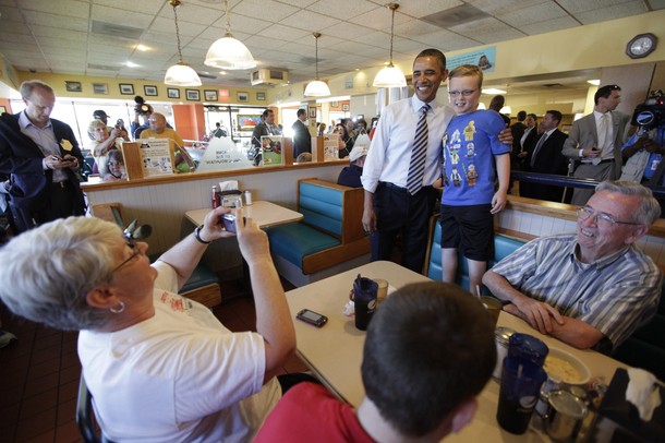 President Obama holds a sleeping baby boy as he visits Ross’ restaurant in Bettendorf, Iowa, June 28
