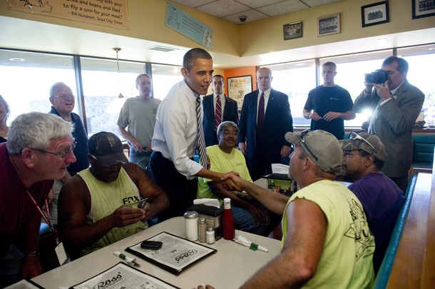 Des Moines Register: ….. The president then made good on a 2008 campaign promise today, making a quick stop at Ross’ Restaurant in Bettendorf. The diner is off Interstate-74 on the way to Alcoa, which is in nearby Riverdale.