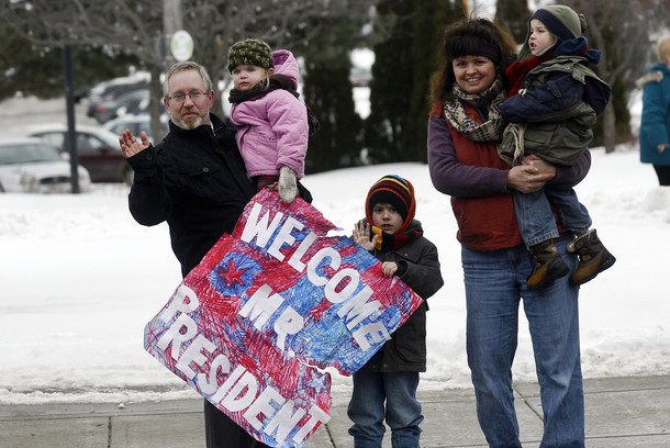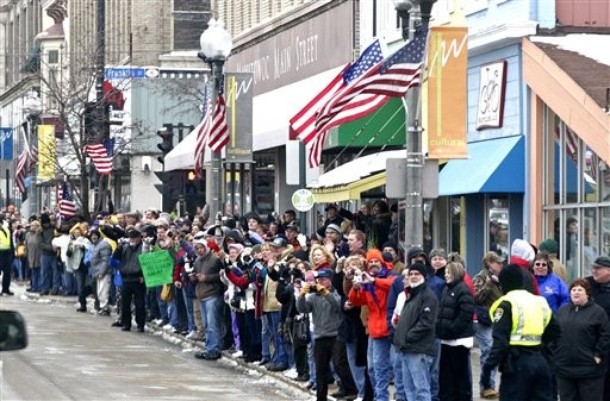 People line the streets to greet President Barack Obama on a visit to Manitowoc, Wis