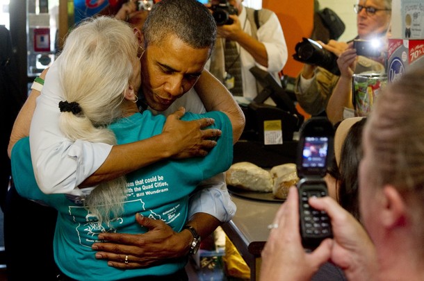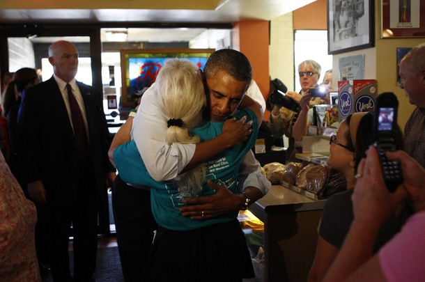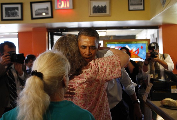 The president greeted Cynthia with a hug, as she walked through the door. She later said she didn’t know he was coming to the restaurant until he arrived. She had stepped to the street to watch his motorcade pass and then was told he was inside.