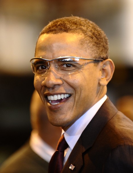 President Barack Obama laughs after commenting on the press corps, who were wearing hair nets on a tour of the Faffa Food factory. “You didn’t get the memo about the baseball caps?” President Obama joked
