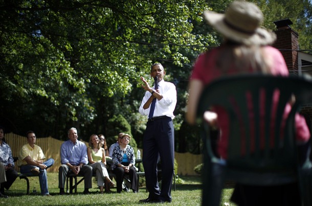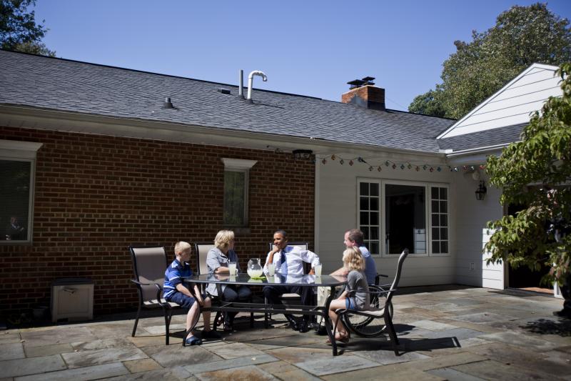 President Barack Obama meets with John and Nicole Armstrong, along with their twin children, in the family’s backyard to discuss Recovery Act investments in Fairfax, Virginia, on September 13