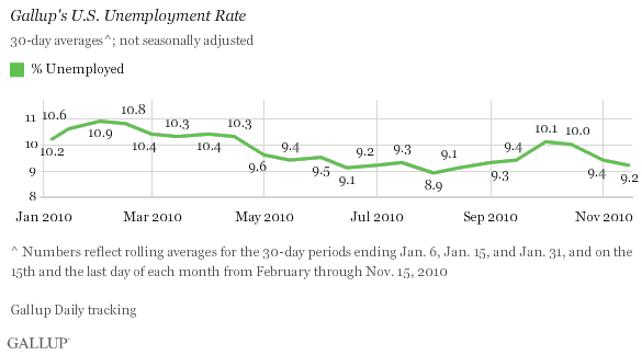 Gallup: Unemployment, as measured by Gallup without seasonal adjustment, declined to 9.2% during the first half of November — down from 9.4% during the last half of October and 10.0% in mid-October — and one of the lowest levels of the year.