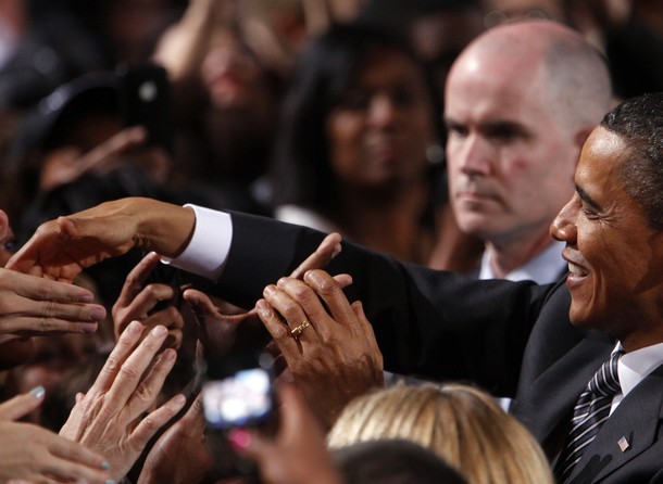 President Barack Obama greets employees after speaking about the economy at the Turner-Fairbank Highway Research Center