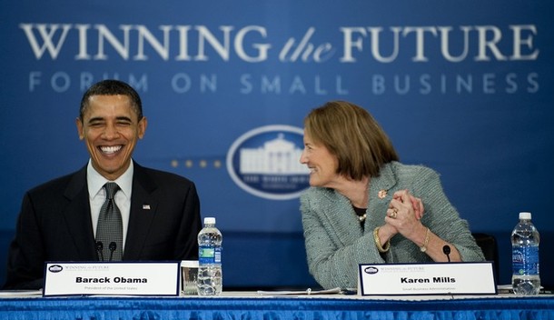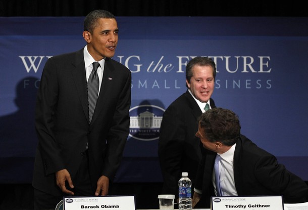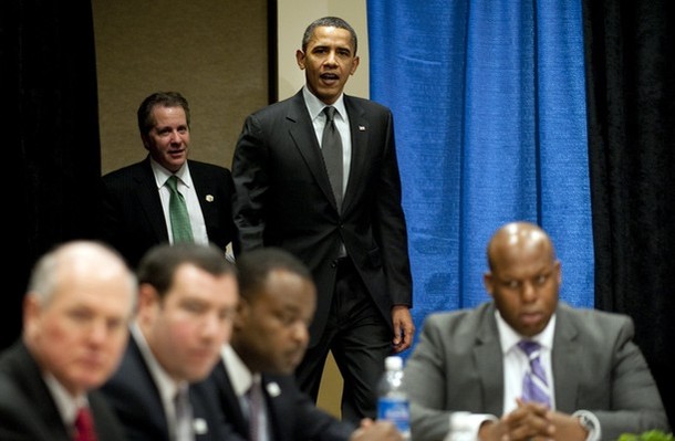 President Obama arrives with Director of the National Economic Council Gene Sperling during a Winning the Future Forum on Small Business in Cleveland, Ohio, February 22