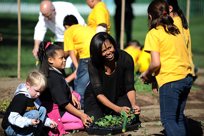 First Lady Michelle Obama and West Virginia Department of Education Office of Child Nutrition Executive Director Richard Goff help students from five District of Columbia schools make a meal using the summer crop from the White House Kitchen Garden in the State Dining Room at the White House June 12. The students, who helped plant the garden earlier in the year, were joined by visiting school nutrition directors from Orlando, Dallas and West Virginia, where they have seen success in their new school lunch programs thanks to the standards put in place by the Healthy, Hunger-Free Kids Act.