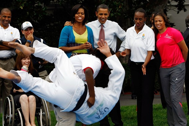 President Obama and First Lady Michelle Obama watch Olympian Ryan Reser, in white, and Paralympian Myles Porter during a judo demonstration, part of the U.S. Olympians youth sporting event on the South Lawn of the White House, Sept. 16, 2009 (Photo by Pete Souza)