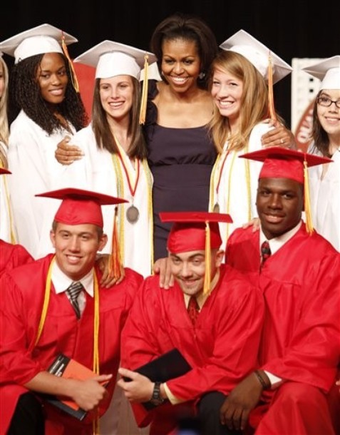 First lady Michelle Obama poses with graduates after commencement ceremonies for the Quantico Middle/High School on the Quantico Marine Base, June 3