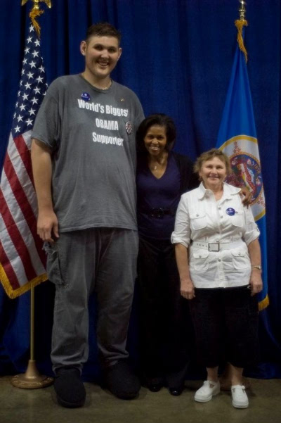 In this Sept. 12, 2009 file photo, Igor Vovkovinskiy, 27, of Rochester, Minn, standing 7-feet and 8-inches tall, shakes hands with President Barack Obama after a health insurance reform rally in Minneapolis. Vovkovinskiy was recognized by Guinness World Records on Monday, May 24, 2010, as the tallest man in the United States.