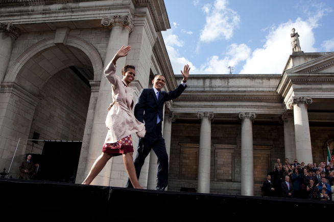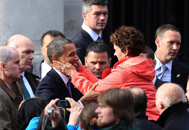 ….Enda was only half way through his speech when a bone-rattling roar erupted in front of him. And out on to the stage, hand-in-hand, strode Barack and Michelle Obama, waving and smiling as a chant of “Obama, Obama” echoed around the buildings.