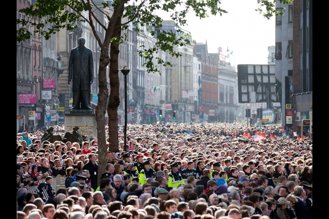 Irish Independent: His voice, that velvet-rich, immense voice, rose and soared and his words were carried by the wind down Dame Street, around College Green, up towards Christchurch, over the sea of people who had come to hear him.