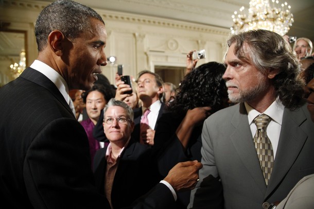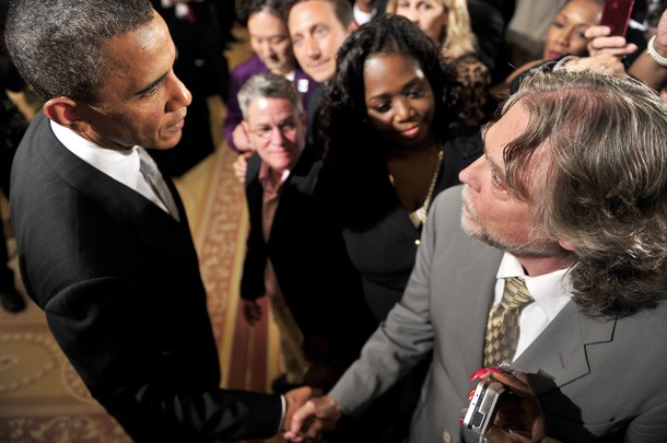 President Obama looks at Charles King (of Housing Works) who heckled him during his remarks about the new National HIV/AIDS Strategy in the White House July 13, 2025