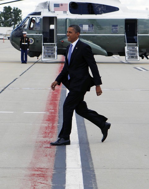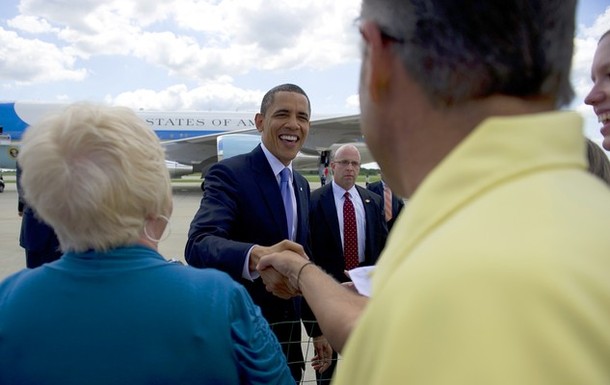 President Obama shakes hands as he arrives at Gerald Ford International Airport in Grand Rapids, Michigan, August 11