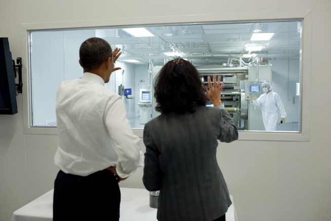 President Obama waves to an employee in a “clean” facility during a tour of Johnson Controls Inc. in Holland, Mich., Aug. 11. Elizabeth Rolinski, vice president of operations at Johnson Controls Inc., right, accompanied the President during the tour of the advanced battery facility