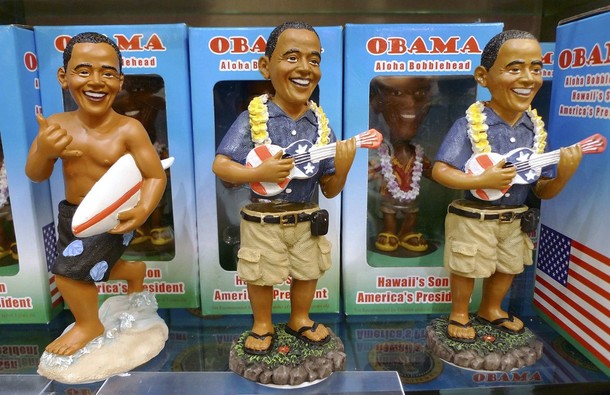 President Obama Aloha Bobblehead Dolls are displayed for sale in the Waikiki Beach area of Honolulu, Hawaii, December 27, 2009.