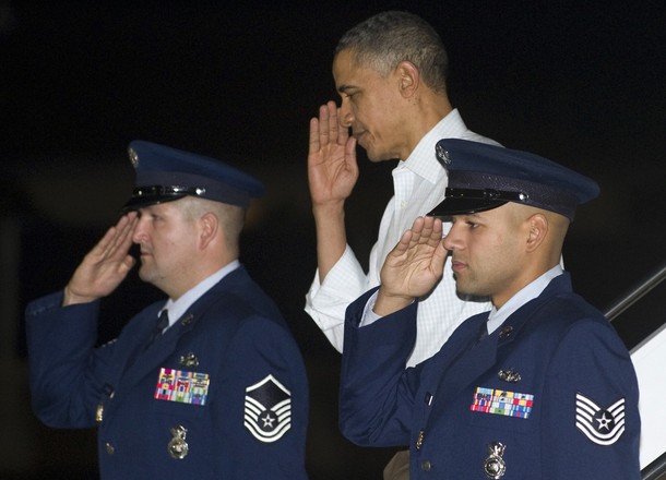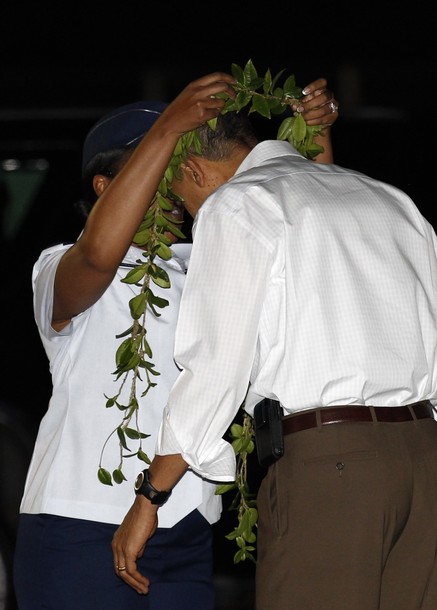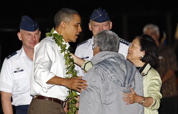 President Obama and first lady Michelle Obama are welcomed by Hawaii Gov. Neil Abercrombie at Hickam Air Force Base in Honolulu