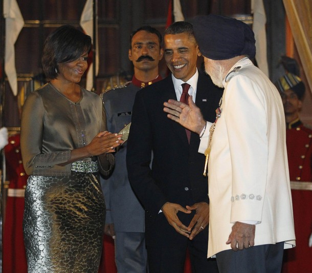 First lady Michelle Obama gives a traditional greeting to Marshal of India’s Air Force, Arjan Singh
