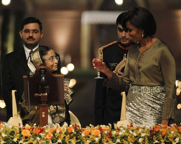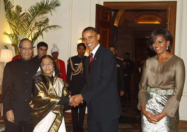 US President Barack Obama shakes hands with Indian President Pratibha Patil as US First Lady Michelle Obama and the Indian President’s husband, Devisingh Patil, look on