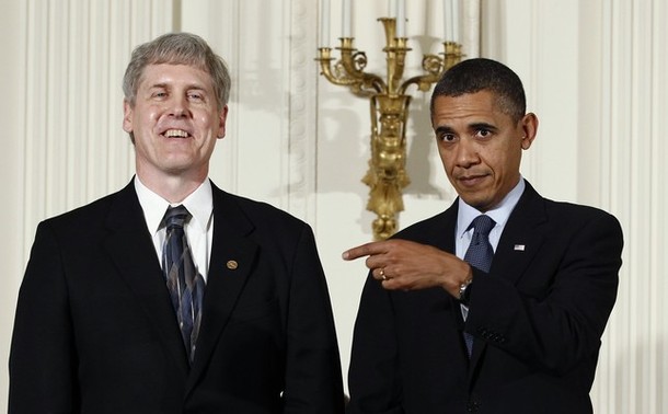 President Barack Obama looks at a mobile payment platform and solar exhibit during the Power Africa Innovation Fair