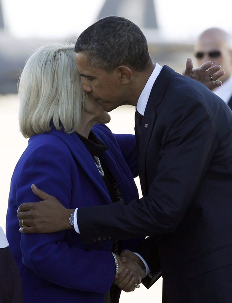 President Obama and Vice President Biden greet Susannah Flanagan, daughter of Frank Buckles, at Arlington National Cemetery Memorial Chapel in Arlington, Va., March 15, 2011. Buckles, the last surviving American World War I veteran, passed away on Feb. 27, 2011, at his West Virginia home. He was 110. (Photo by Pete Souza)