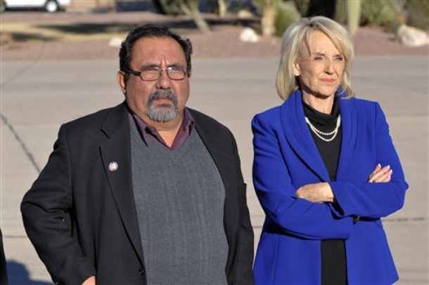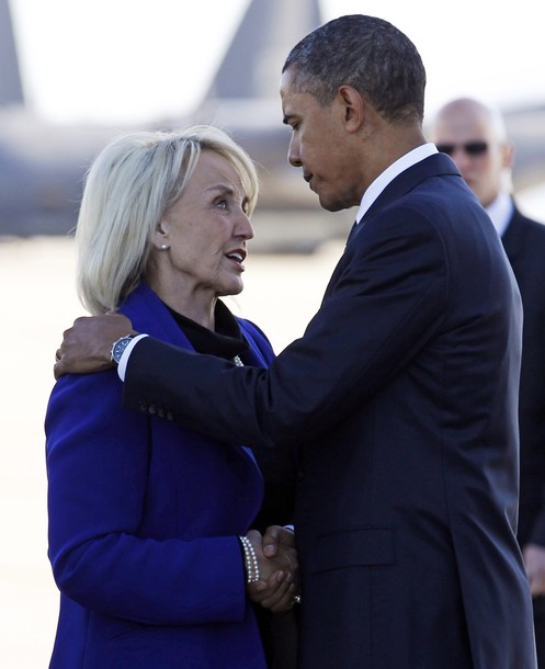 Arizona Governor Jan Brewer and Rep. Raul Grijalva await the arrival of President Barack Obama and first lady Michelle Obama (read what Raul went through in Arizona last year: here)
