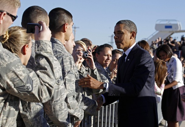 Security personnel keep vigil as President Barack Obama and First Lady Michelle Obama disembark from Air Force as they arrive at Davis-Monthan Air Force Base in Tucson