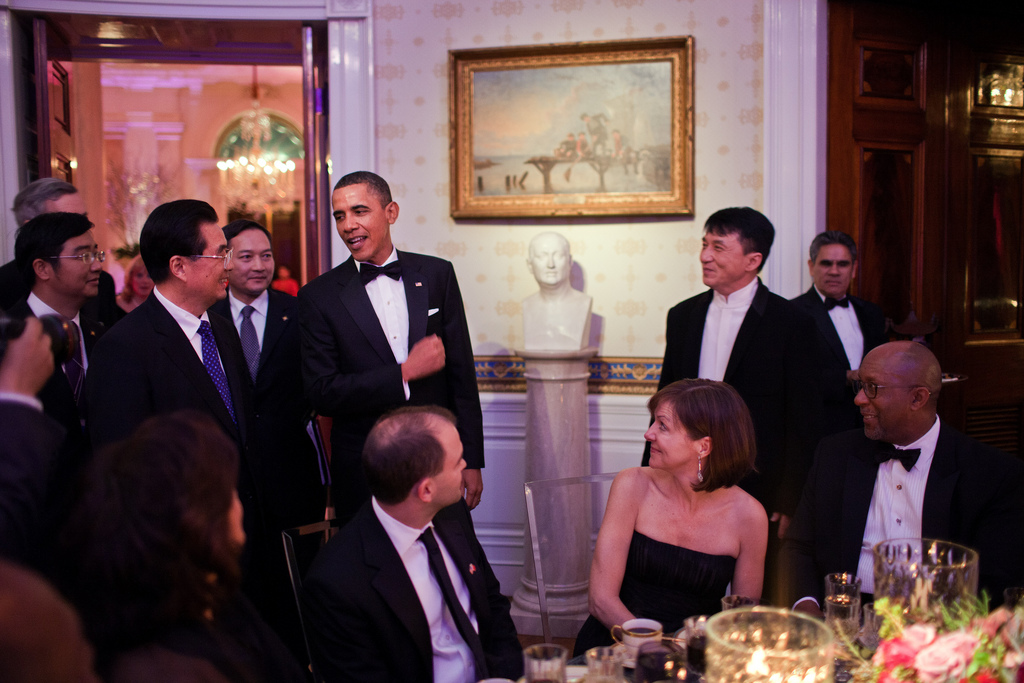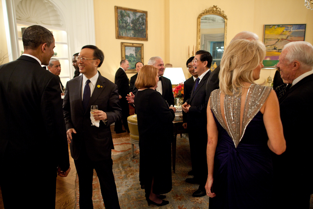 President Barack Obama and President Hu Jintao of China talk with guests during a reception in the Yellow Oval Room in the Residence of the White House
