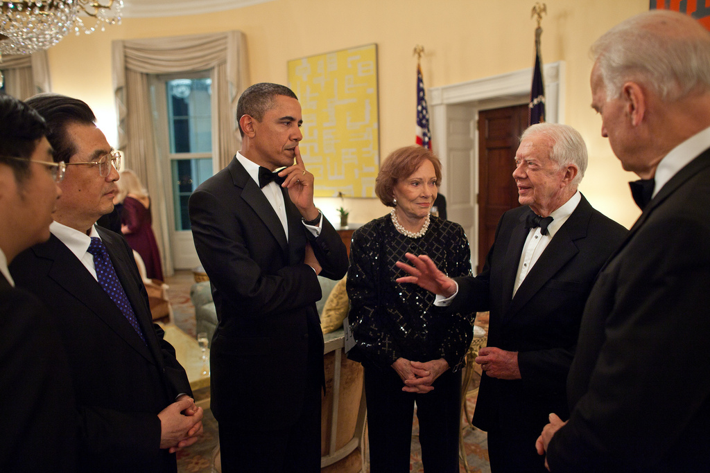 President Barack Obama, along with President Hu Jintao of China, former First Lady Rosalynn Carter, and Vice President Joseph Biden, listen to former President Jimmy Carter during a reception in the Yellow Oval Room in the Residence of the White House, Jan. 19, 2011. (Official White House Photo by Pete Souza)