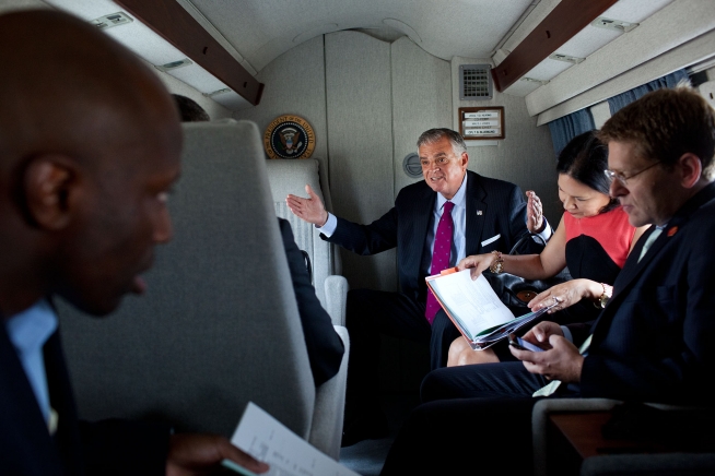 Transportation Secretary Ray LaHood talks with President Barack Obama aboard Marine One during a flight from the White House to Joint Base Andrews, Md., Sept. 22, 2011. Riding aboard Marine One, from left, are: Personal Aide Reggie Love; Nancy-Ann DeParle, Deputy Chief of Staff for Policy; and Press Secretary Jay Carney. (Official White House Photo by Pete Souza)