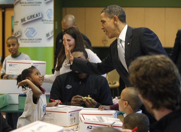President Barack Obama high-fives with a girl as they put together care packages for members of the military and the homeless at the Boys and Girls Club of Washington, December 13