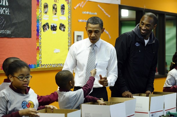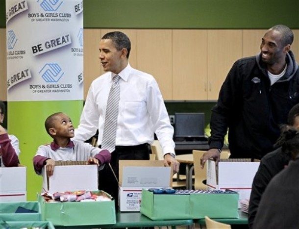 President Barack Obama with Kobe Bryant of the Los Angeles Lakers at a service event at the Boys and Girls Club at THEARC, December 13, in Washington