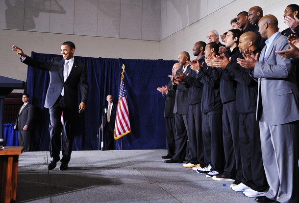 President Barack Obama poses with Los Angeles Lakers as he welcomes the team to honor their 2009-2010 season and their second consecutive NBA championship