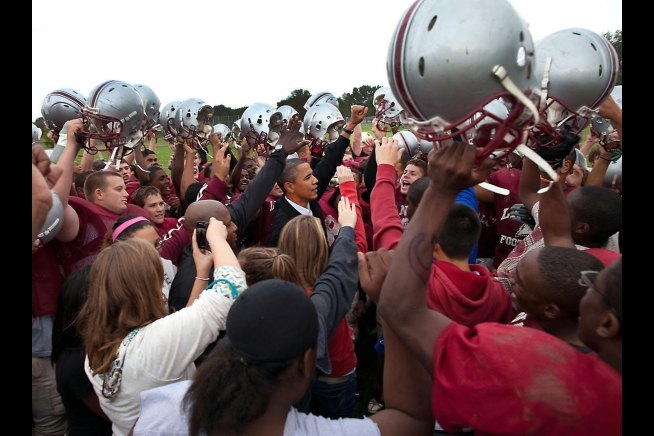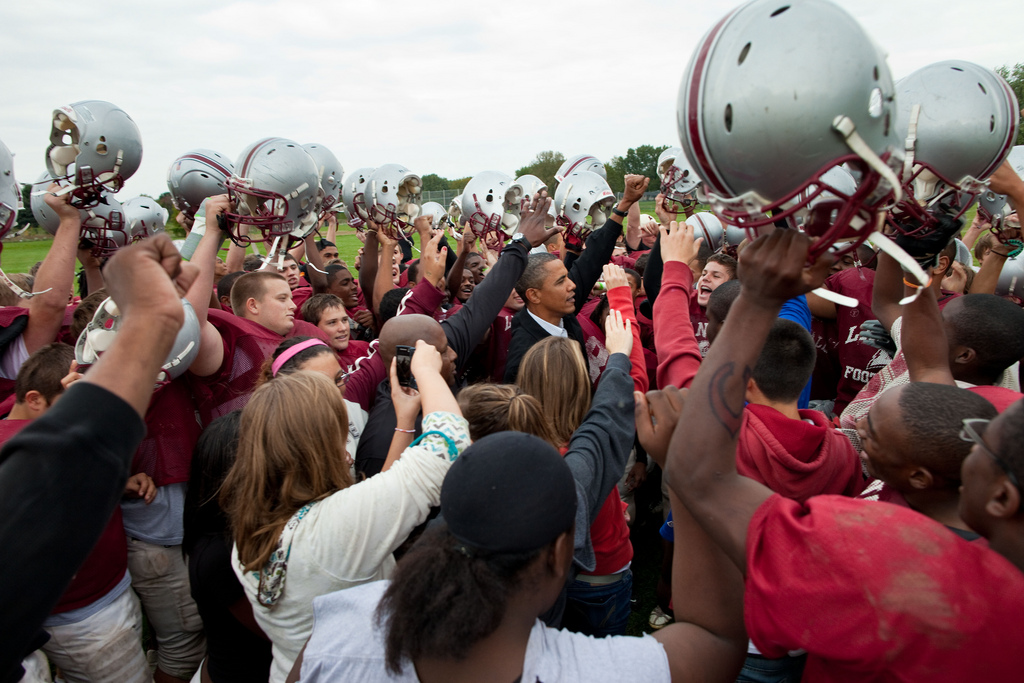 President Barack Obama is surrounded by the La Follette Lancers football team during an unannounced stop at La Follette High School in Madison, Wisc., Sept. 28, 2010. (Official White House Photo by Pete Souza)