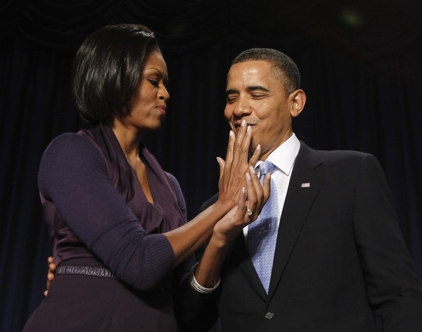 First lady Michelle Obama wipes lipstick from the face of President Barack Obama after they kissed following his remarks at the National Prayer Breakfast at a Washington hotel February 4, 2010.