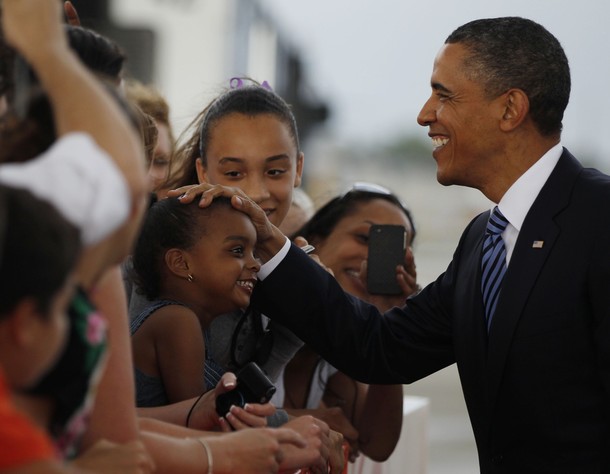 President Barack Obama greets a child after he stepped off Air Force One in Miami, Friday, April 29