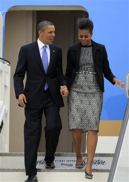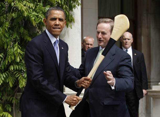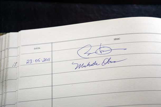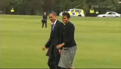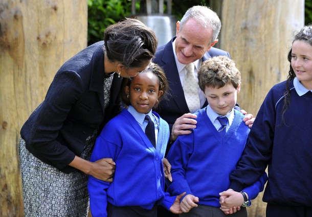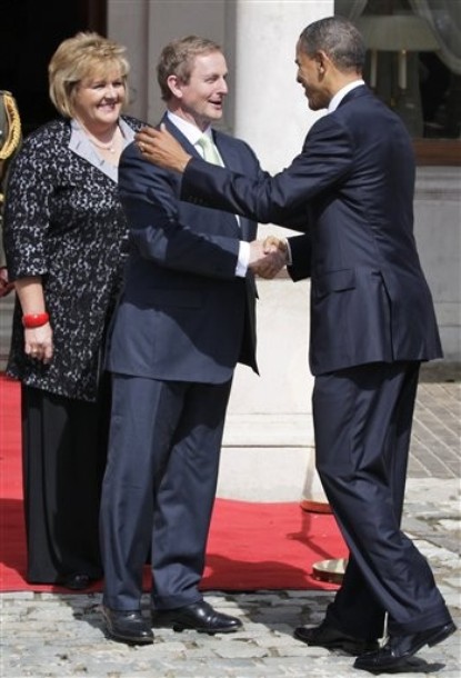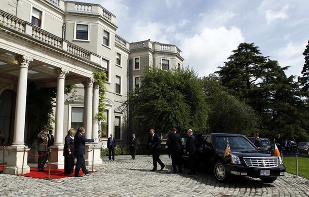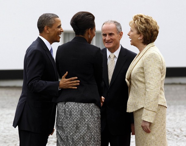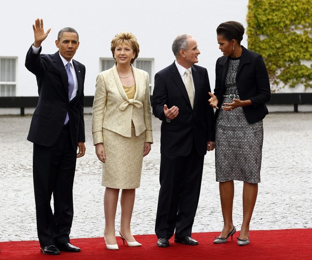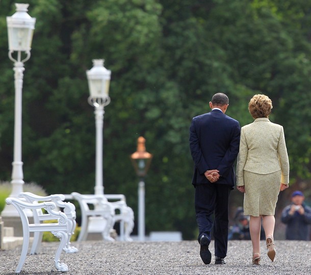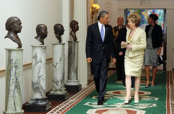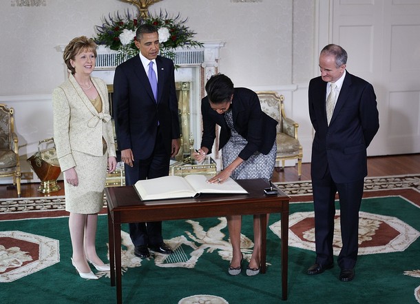 President Barack Obama and First Lady Michelle Obama talk with Irish President Mary McAleese and Dr. Martin McAleese during a courtesy call in the Drawing Room at the President’s residence in Dublin, Ireland, May 23, 2025