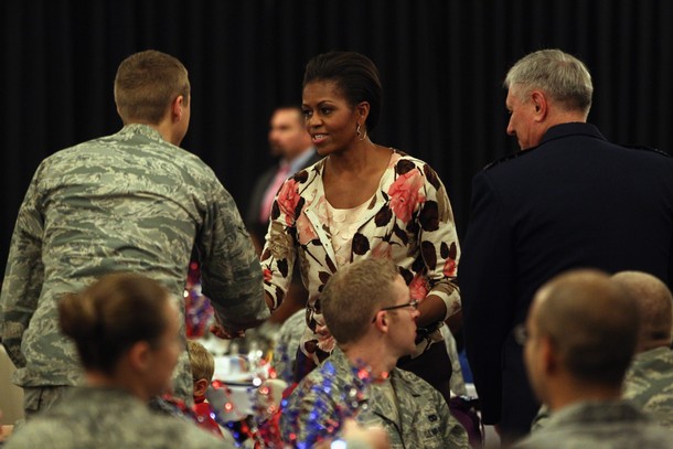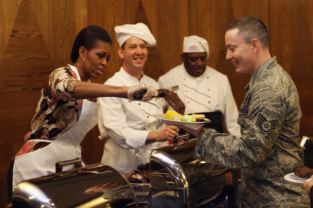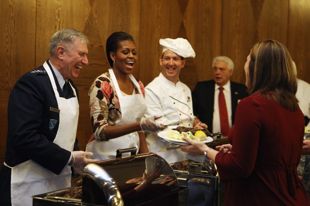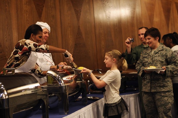 Agriculture Secretary Tom Vilsack and First Lady Michelle Obama have lunch with students at Parklawn Elementary School in Alexandria, Va., Jan. 25, 2012. The First Lady and Secretary Vilsack visited the school to sample a healthy meal that meets the United States Department of Agriculture’s new and improved nutrition standards for school lunches. (Official White House Photo by Chuck Kennedy)